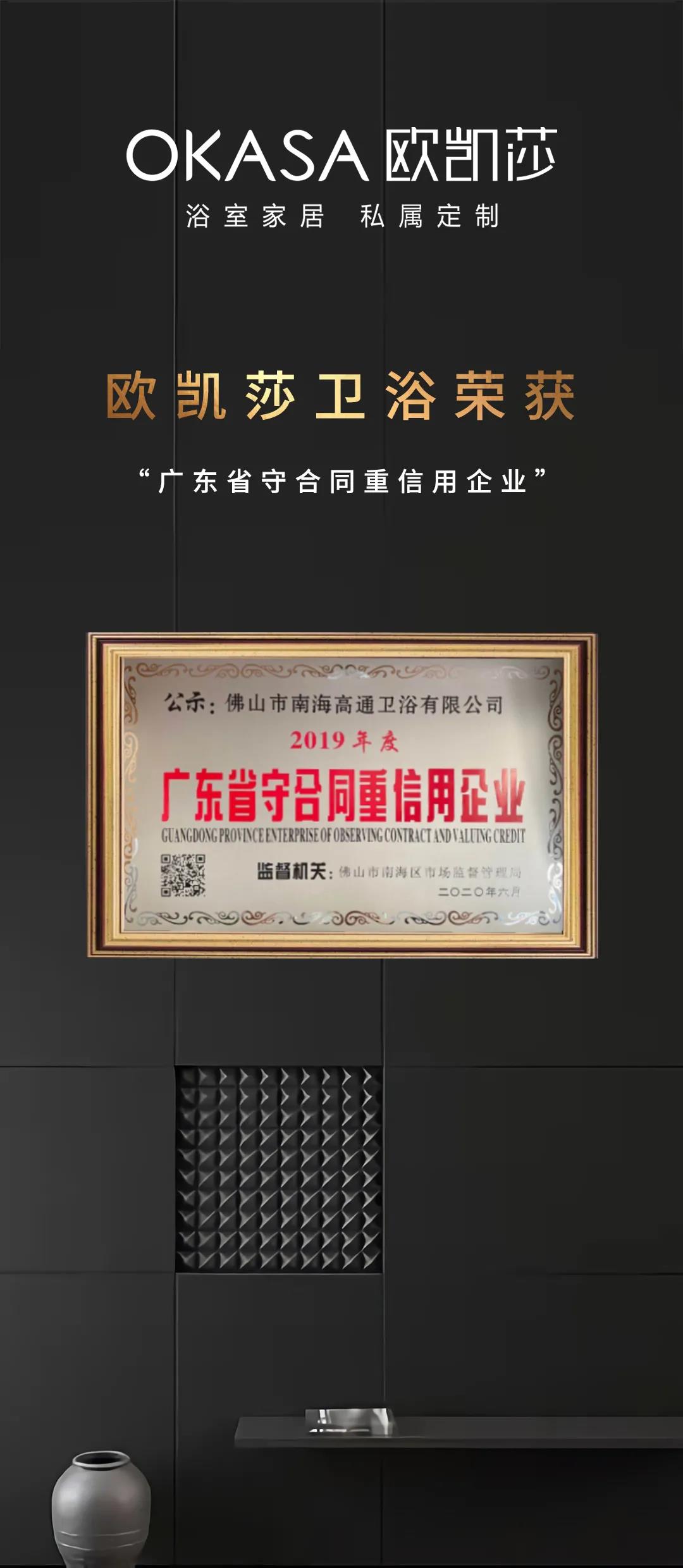 歐凱莎衛(wèi)浴榮獲 “廣東省守合同重信用” 企業(yè)稱號(hào)